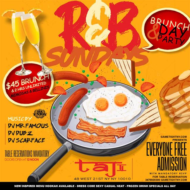 For more information/ table reservations on Taj NYC Sunday Funday Hip Hop vs. Reggae® Brunch & Day party birthday or guestlist call 3475920300 or log onto Gametightny.com